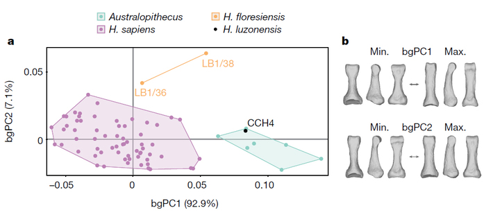 Рис. 5. Сравнение формы проксимальной фаланги пальца ноги H. luzonensis и других гоминид методом главных компонент. Видно, что по форме этой косточки лусонский человек близок к австралопитекам и сильно отличается от сапиенсов и флоресских хоббитов. Рисунок из обсуждаемой статьи в Nature