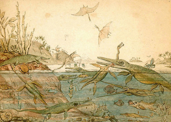 Акварельный рисунок, изображающий жизнь древнего водоёма на территории нынешнего графства Дорсет в западной части Англии. Его автор — Генри де ла Беш (1796–1855), английский геолог и палеонтолог