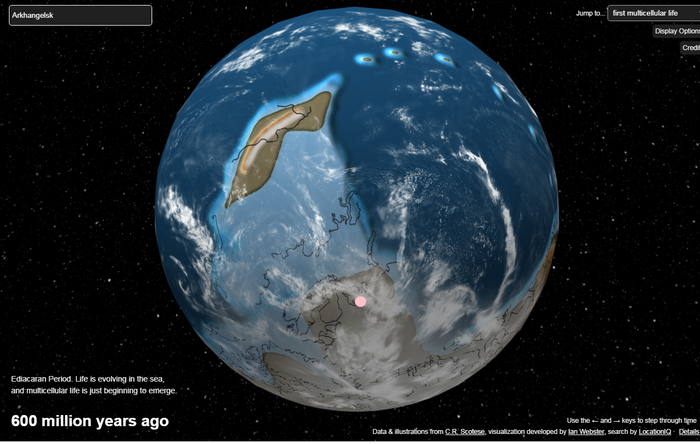 Расположение Архангельска 600 миллионов лет назад. Почти на южном полярном круге, вот такие путешествия.