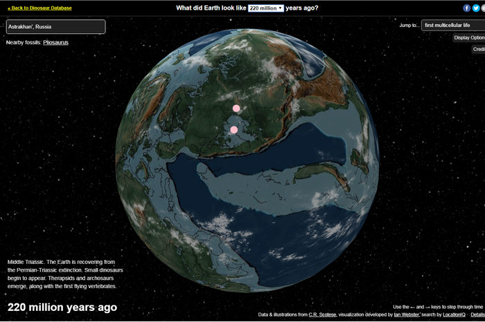 Расположение Оренбурга и Астрахани 220 миллионов лет назад.