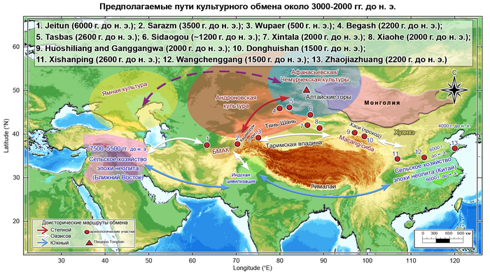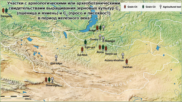 Особый интерес в этом контексте представляют растущие археоботанические свидетельства со всей Центральной Азии, о притоке проса и других одомашненных злаков в степи Сибири, Казахстана и Северо-Западного Китая начиная ещё с 4-го тысячелетия до н. э. (в течение 2-го тысячелетия на территории Монголии).