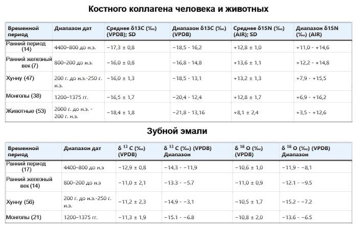 При этом в костном коллагене стабильные изотопы углерода в основном отражают белковую часть рациона, а в гидроксиапатите зубной эмали всю диету.