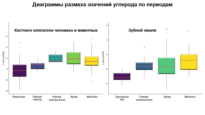 Индивидуальные значения стабильных изотопов углерода коллагена и зубной эмали для Монгольской империи и хунну варьируются от тех, которые указывают на чистую диету С₃, до тех, которые предполагают интенсивное потребление растений С₄. Интересно, что в этот период у нескольких захороненных значения δ¹³C были ниже, чем в ранний период, что, наряду с более низкими значениями δ¹⁵N, указывает на основное потребление растений С₃, вероятно, таких культур, как пшеница и ячмень.