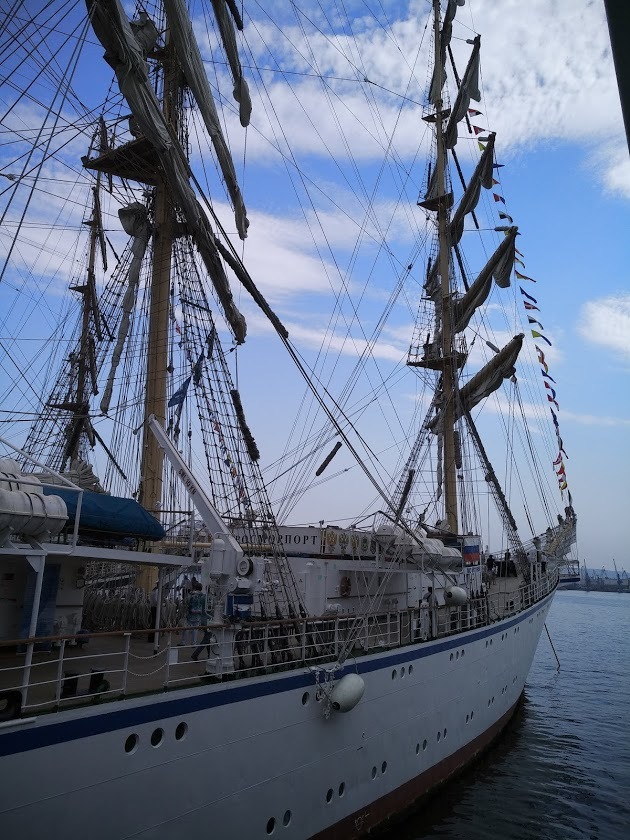 Добрались мы до парусника не с первого раза - в адресе был указан 42 причал, а он довольно протяженный, и к морю просто так не выехать - повсюду контейнеры, ограждения, проходные. Сунулись на одну проходную - нет "Паллады", на вторую - тоже нет, карта нас вообще увела черти куда. В итоге мы просто поднялись на видовую и оттуда тут же высмотрели мачты парусника.
