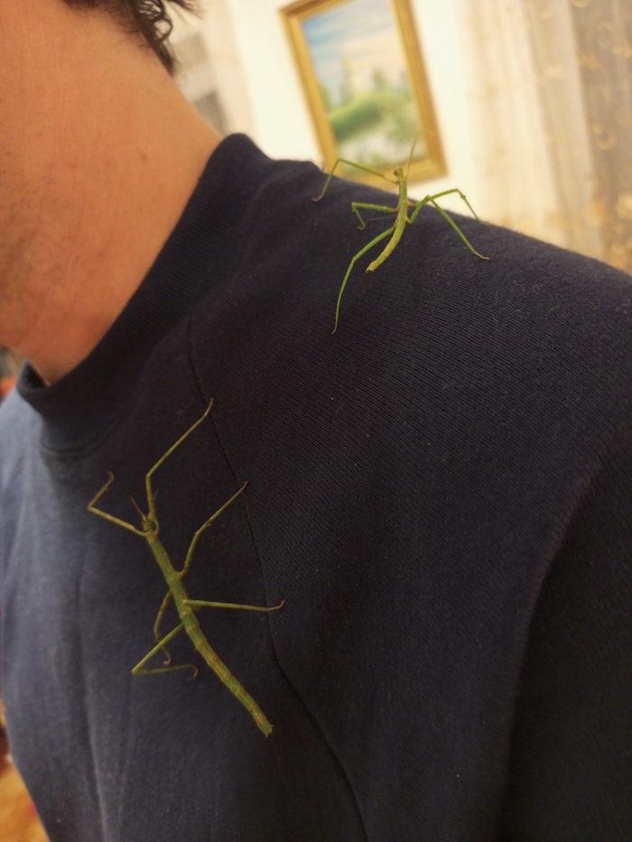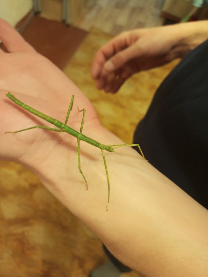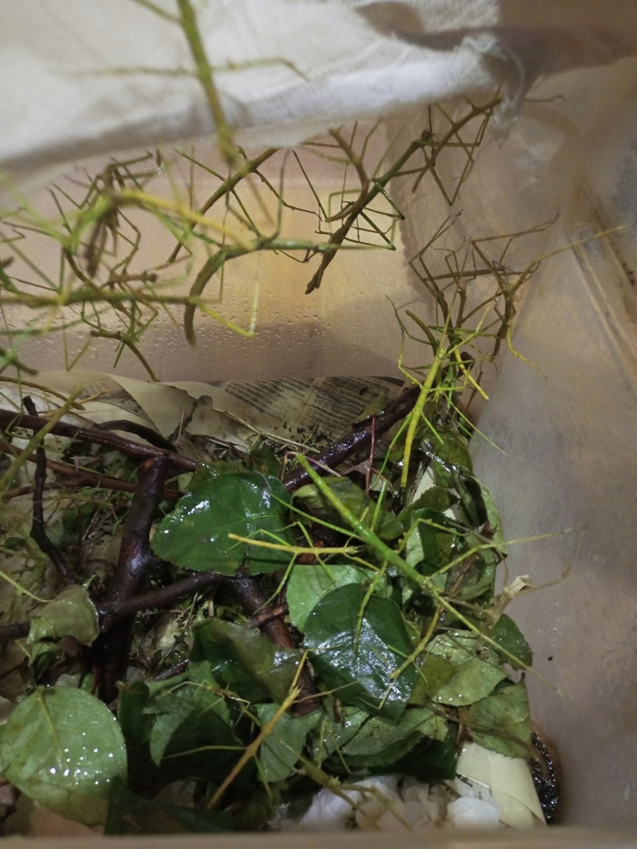 Я внезапно завела палочника... Принесли мне его в пластиковом контейнере+ листики для еды+ немного грунта. Я почитала , подготовила для него небольшой аквариум в качестве инсектАрия. Насыпала туда влажный кокосовый грунт, воткнула веточки, кинула листики, которые шли в качестве приданного. Взяла палочку и аккуратно переселила эту мелкую козявочку. Назвала Укропчик.