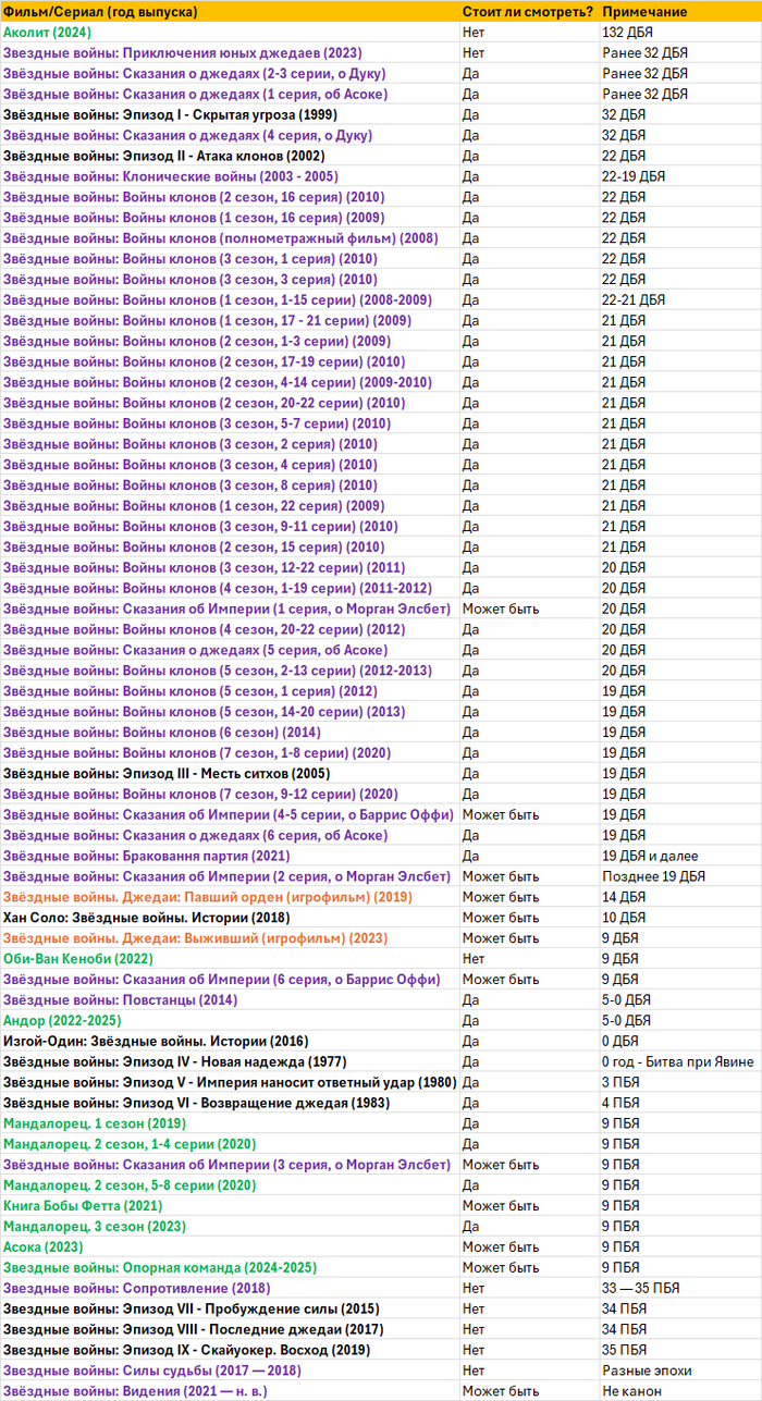 Для этих целей я составил таблицу со всеми вышедшими на сегодня проектами по "Звёздным войнам" и обозначил, какие из них достойны просмотра и важны для понимания истории.