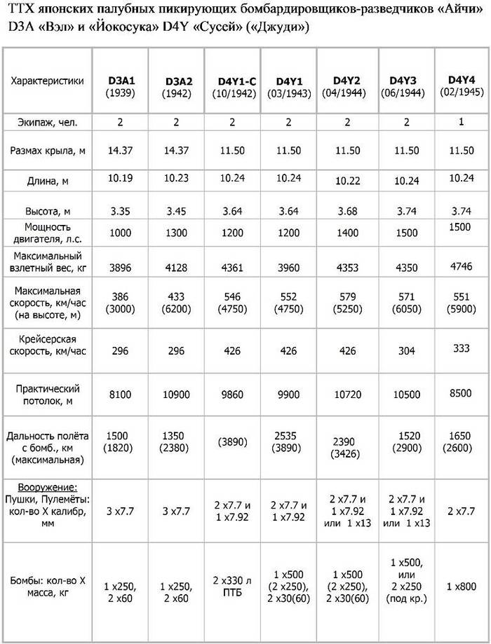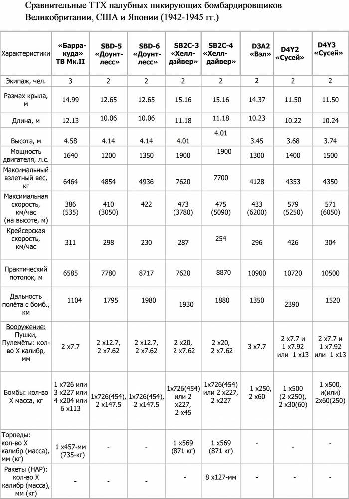 Из приведённой ниже сравнительной таблицы характеристик палубных торпедоносцев основных противоборствующих сторон на Тихоокеанском ТВД видно, что японским авиастроителям к концу второй мировой войны удалось создать самолёты не уступающие, а по некоторым показателям и превосходящие американские аналоги. Аналогичную картину мы могли видеть и в ряду палубных пикирующих бомбардировщиков.