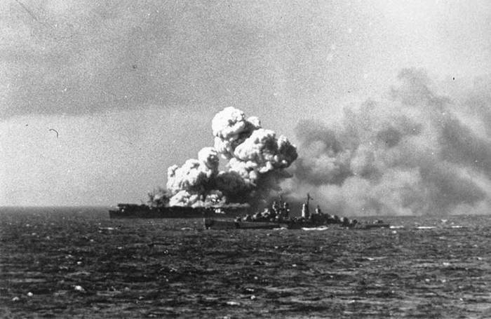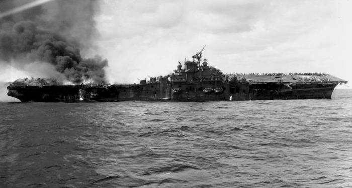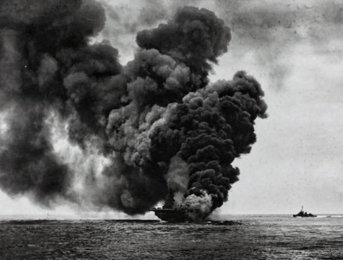 Горящий авианосец «Франклин» (CV-13) после успешной атаки пикирующего бомбардировщика D4Y3 «Сусей», 19.04.1945 г.