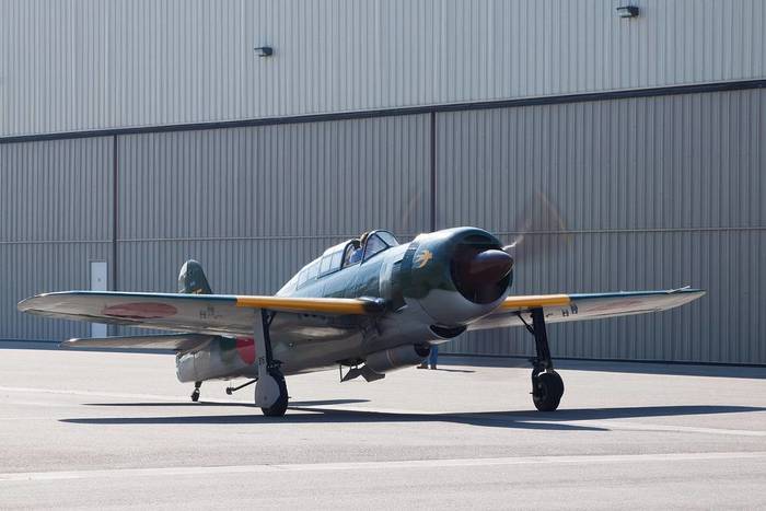 Восстановленный D4Y3 «Сусей» («Джуди») прогревает двигатель на территории авиамузея в Чино, Калифорния, США