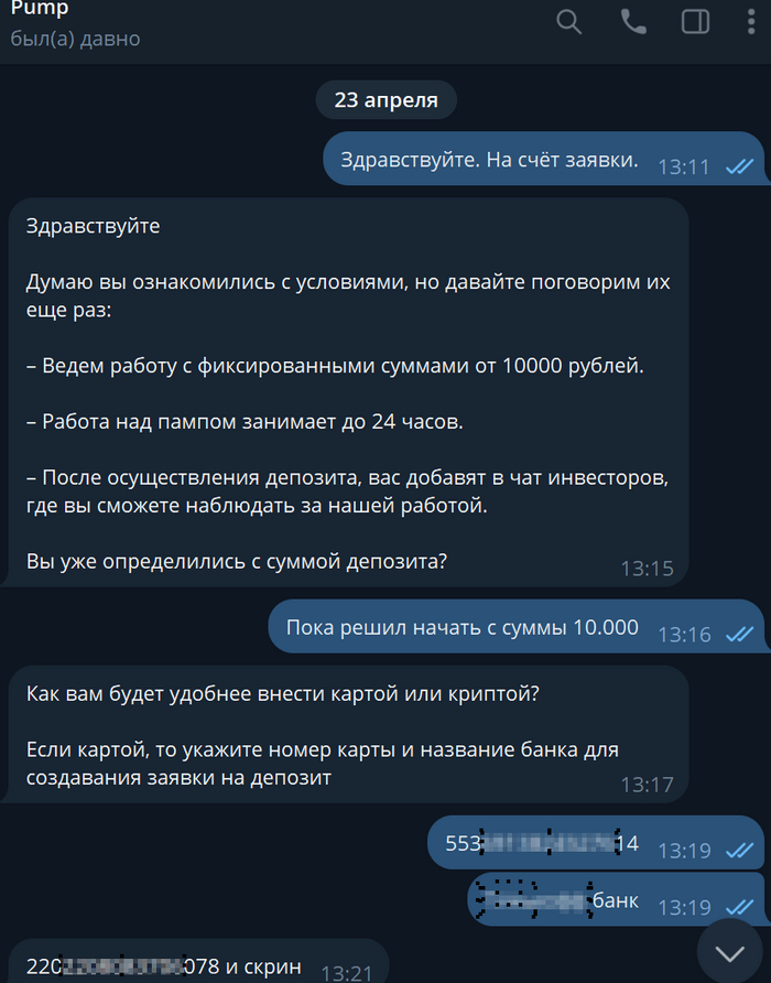 Как видно на скриншоте выше, для участия в данной схеме, нужно связаться с админом, оставив заявку, что я и сделал. Меня спросили, с какой суммы я готов начать, и какой способ оплаты мне подходит. Я ответил - с 10.000, оплатить готов на карту. После чего мне прислали реквизиты карты для перевода необходимой суммы.