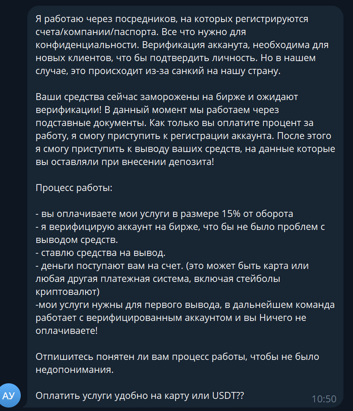 Осталось ждать следующего дня. На следующий день снова ждал сюрприз. Для вывода средств нужно было верифицировать аккаунт на бирже, с которой выводят средства. Но из-за санкций против России это сделать непросто. НО! Есть специальный человек, который за комиссию 15% (аж 15%!) сможет это сделать. С суммы 45000р, комиссия составит 6750р. Сказали, это надо сделать только один раз, потом аккаунт будет верифицирован и со следующих сделок это делать не придётся. Сказали написать этому человеку в лс.