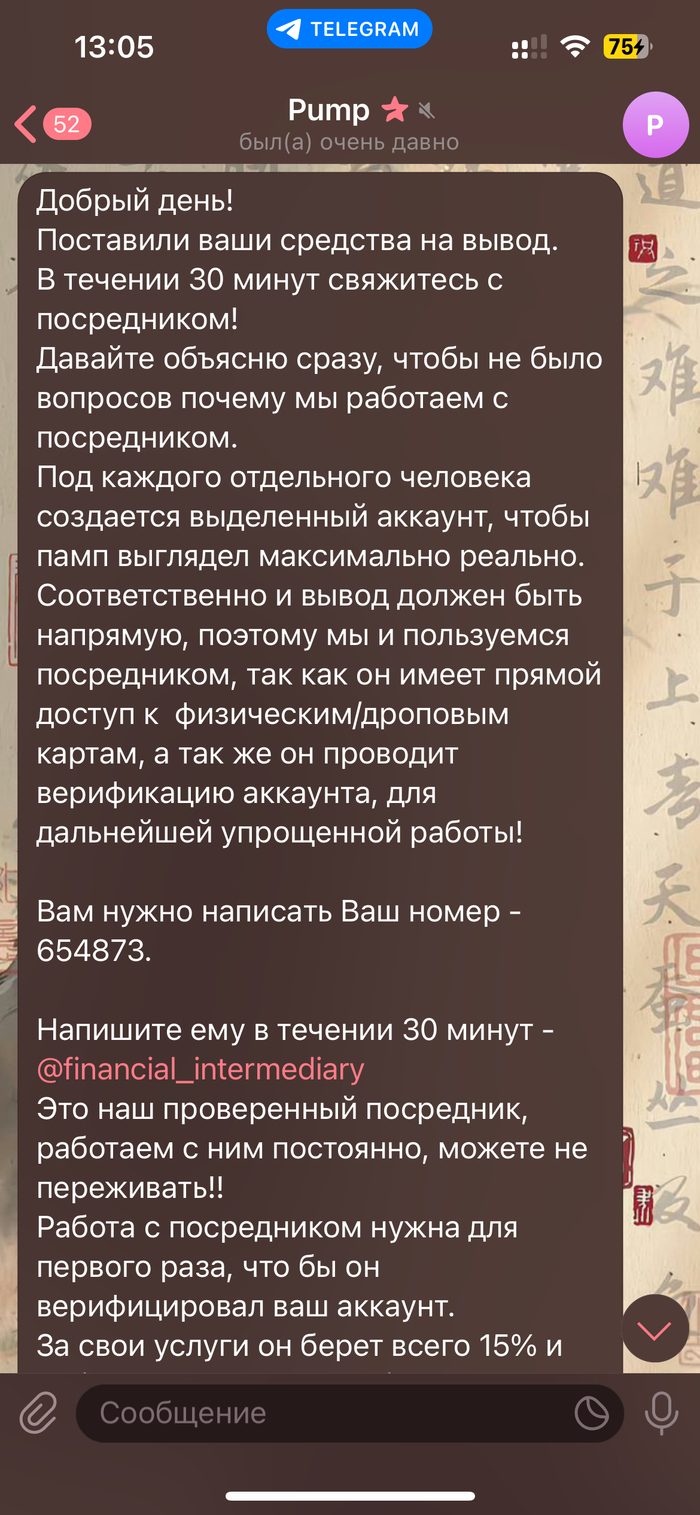 Тинькофф не хотел переводить средства на его карты. (Видимо, что-то знал.) Тогда я отправил деньги из другого банка. После получения средств посредник меня забанил. Через 10 минут меня забанил и админ, которому я подавал заявку для участия в данном разводе. А ещё через пару часов я остался один в чате.
