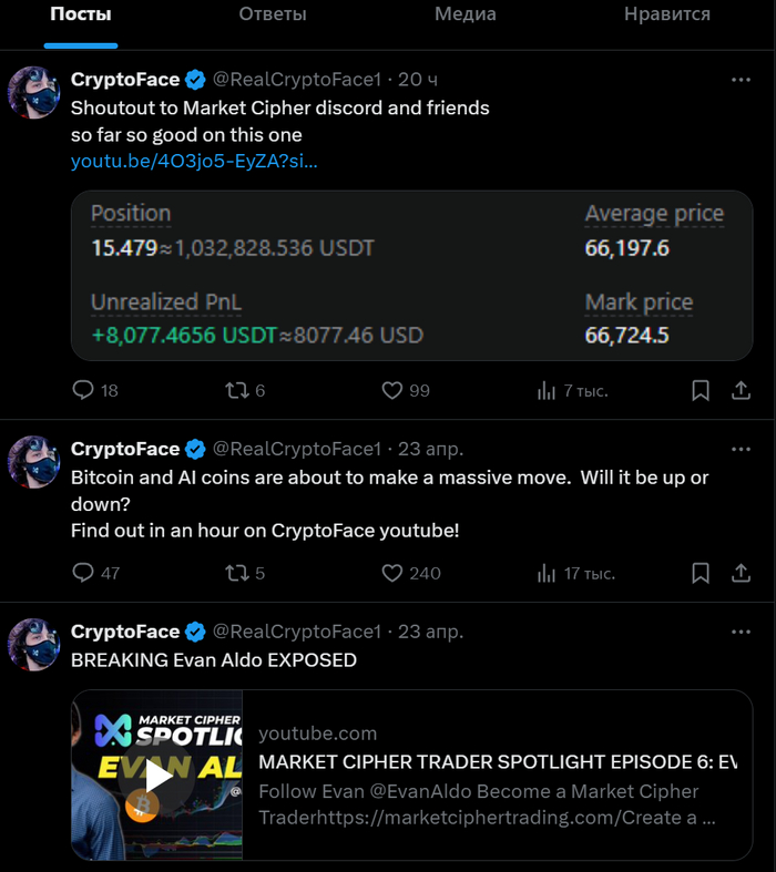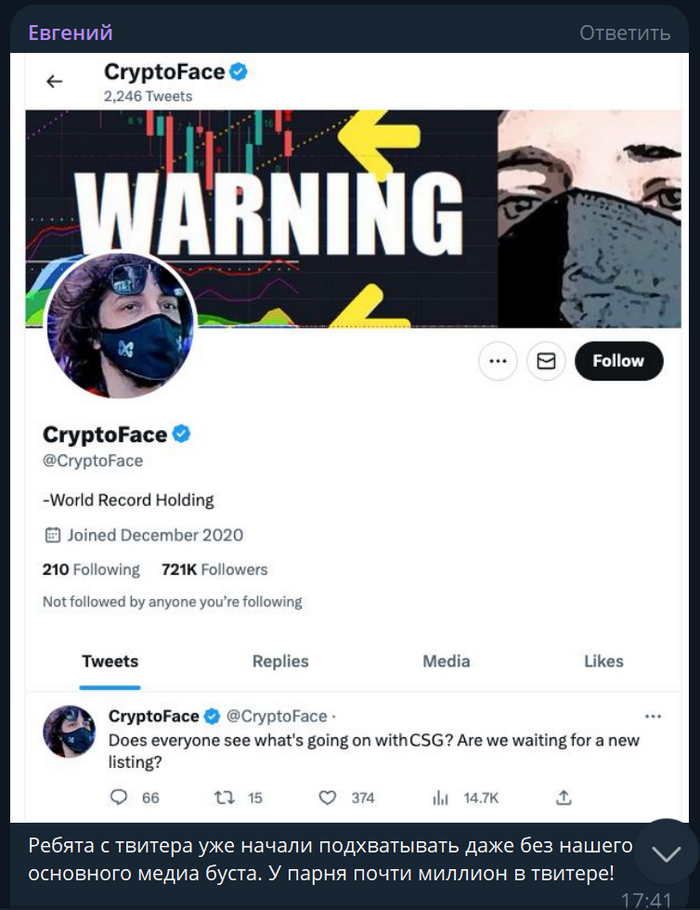 Спустя ещё некоторое время было сказано о размещении твита на одном крупнейшем аккаунте о криптовалюте CryptoFace.