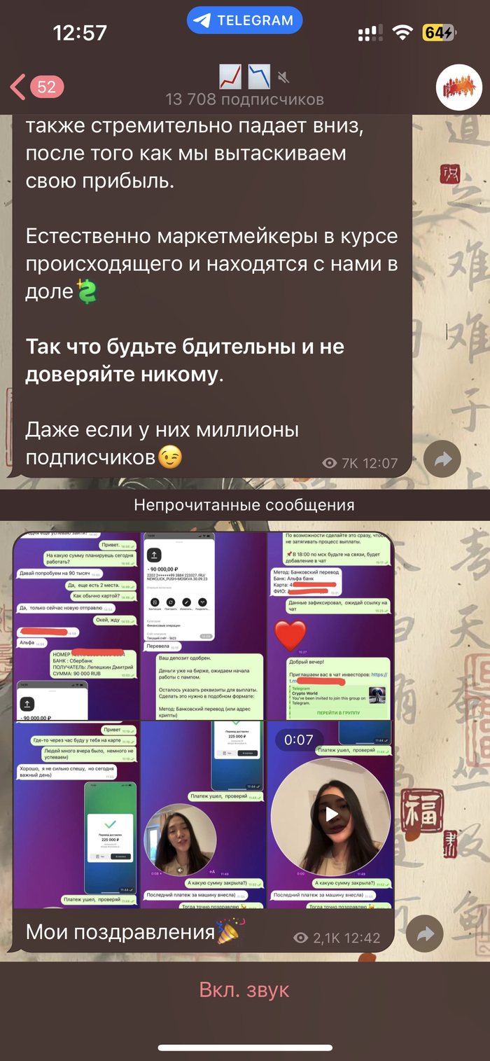 Когда вы переводите им деньги, вас приглашают в закрытую группу, чтобы вы следили за тем, как ваши деньги превращаются в миллионы. Но вот не задача, тот милый менеджер начинает кричать в этой группе, что срочно нужно перевести еще 8 тысяч. На бирже конкурент, а сумма выплаты будет увеличена в 10 раз!!!