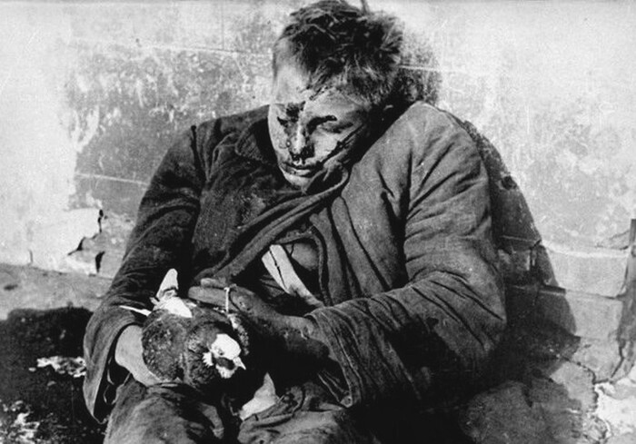 На нём снят 16-летний Витя Черевичкин из Ростова-на-Дону с мёртвым голубем в руке, убитый немцами 28 ноября 1941 года. Его казнили за то, что он не только не подчинился приказу и не уничтожил своих голубей, но и с их помощью сигнализировал нашим войскам. Найденным у него голубям оторвали головы, самого парня после долгих пыток и избиений расстреляли. Голубя, которого Витя держал в руке, нашли у него за пазухой, видимо, прятал до самого расстрела, в последний миг хотел выпустить, но не успел.