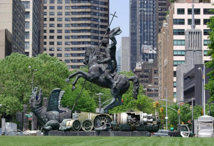 Скульптура установлена перед зданием ООН в Нью-Йорке в 1990 году и символизирует окончание холодной войны.