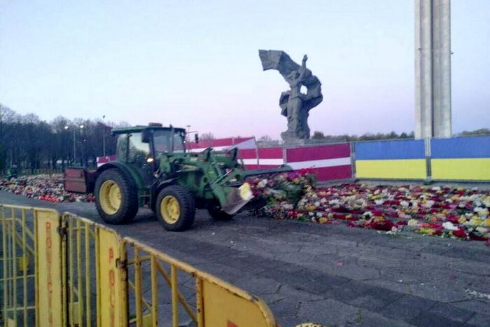 Ранним утром 10 мая латыши решили убрать наши цветы у Монумента. Вручную не удалось, слишком много. Потому подогнали бульдозер и несколько грузовиков…