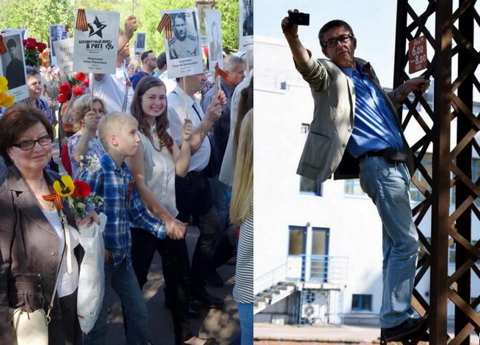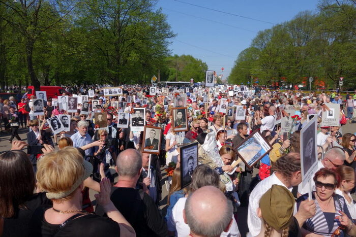 В начале 2010-х в Латвии поднялась тема «Бессмертный полк». Русские, выкопали из своих архивов фотографии отцов и дедов, распечатали, наклеили на фанерки и пошли 9 мая к Монументу. Огромной рекой. Я жил тогда в паре километров от парка Победы и видел, как ручейки людей с цветами и портретами своих героев стекаются в речки, речки стекаются в непрерывный людской поток. Десятки тысяч людей, до горизонта… Это фото — моё, свидетельствую: