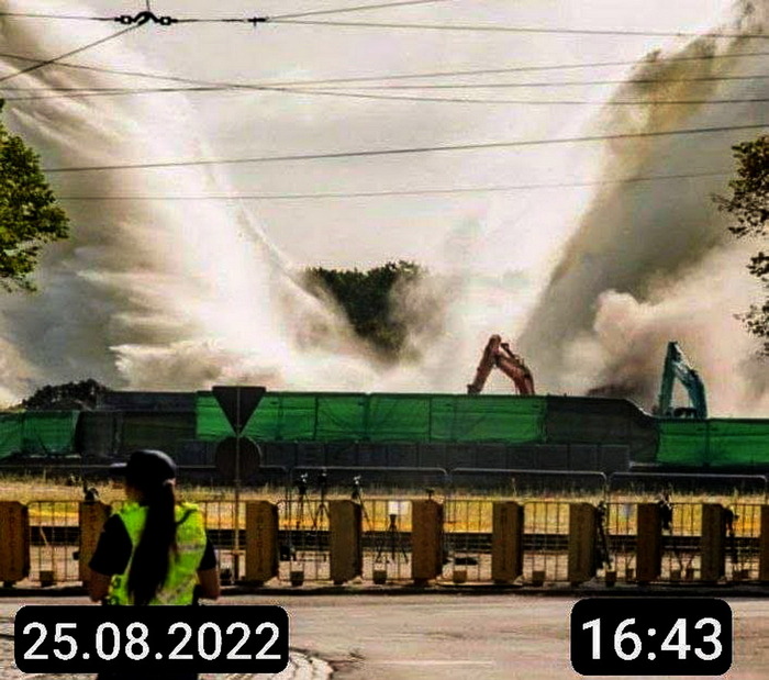 Потом внутрь периметра загнали тяжелую технику и начали работу. Причём, фирму-подрядчика для сноса наняли из Литвы, по-видимому местные не захотели подписываться на такой позор. Работали круглосуточно, активнее — по ночам, когда меньше зрителей.