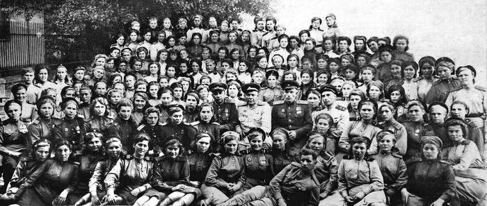 (Белова Мария Герасимовна прямо над сидящим младшим лейтенантом в темной форме)
