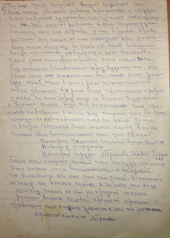 «Да еще когда видишь бегут беженцы, то мать несет убитого ребенка прижимая к груди это невинное существо или убитая женщина и на ней лазит ребенок а она не реагирует потому что она мертва. У нас в роте взяли ребенка лет шести он так находился при роте ему шили форму. Но остался жив говорят когда приезжали на встречу к нам в Ульяновск. У меня даже есть фотография это мальчика. Еще остались вспоминания город Будапешт его брали шли ожесточенные бои, там есть река Буда –Пешт (возможно идет речь о Дунае, так она разделяла Буда и Пешт. Прим. мое). Там в этой реке плыли плоты тела убитых вся река была пропитана кровью. У меня за этот медаль за взятие Будапешта и взятие Вены. Ведь все не опишешь что пришлось пережить я только хочу сказать что бы это не когда не повторилось что бы ваши дети и внуки не знали что такое слово война.