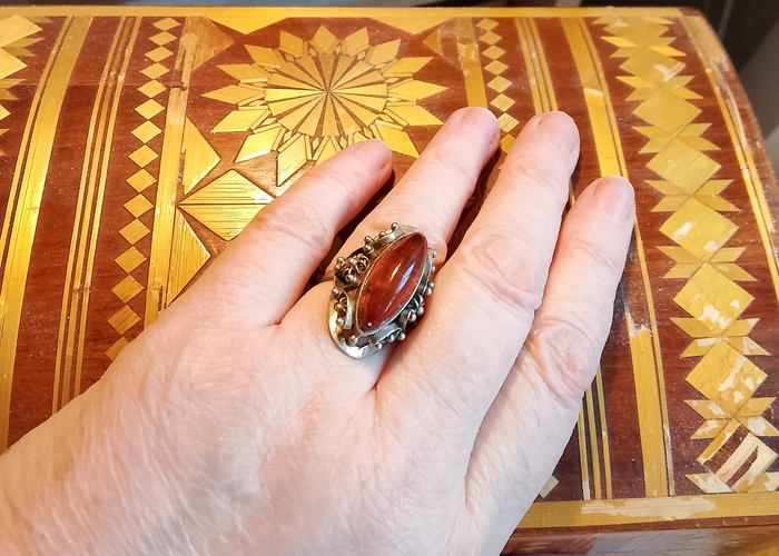 Когда я надеваю бабушкины, мамины или тётины серьги или кольцо, то словно путешествую во времени. Вот колечко серебряное с янтарем, его носила моя тётя. Оно мне немного тесное, у моей тёти были пальчики намного изящнее, но я все-таки втиснула свой палец и сразу расслабился подбородок, рот расплылся в улыбке. Много ли надо женщине для счастья?