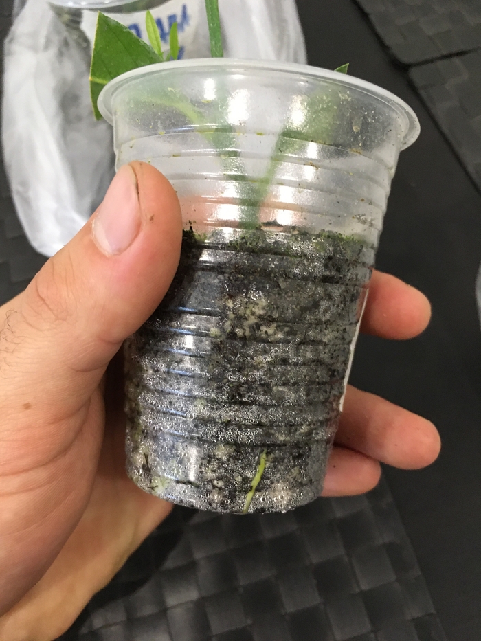 И стаканчика вытаскивать не стал, толку нет, корешок весь в земляном коме, вот только кусочек видно: