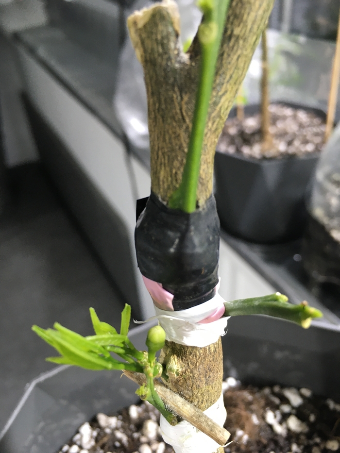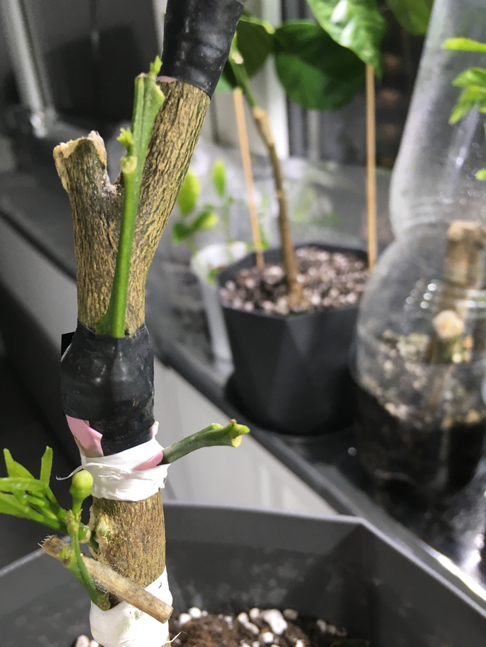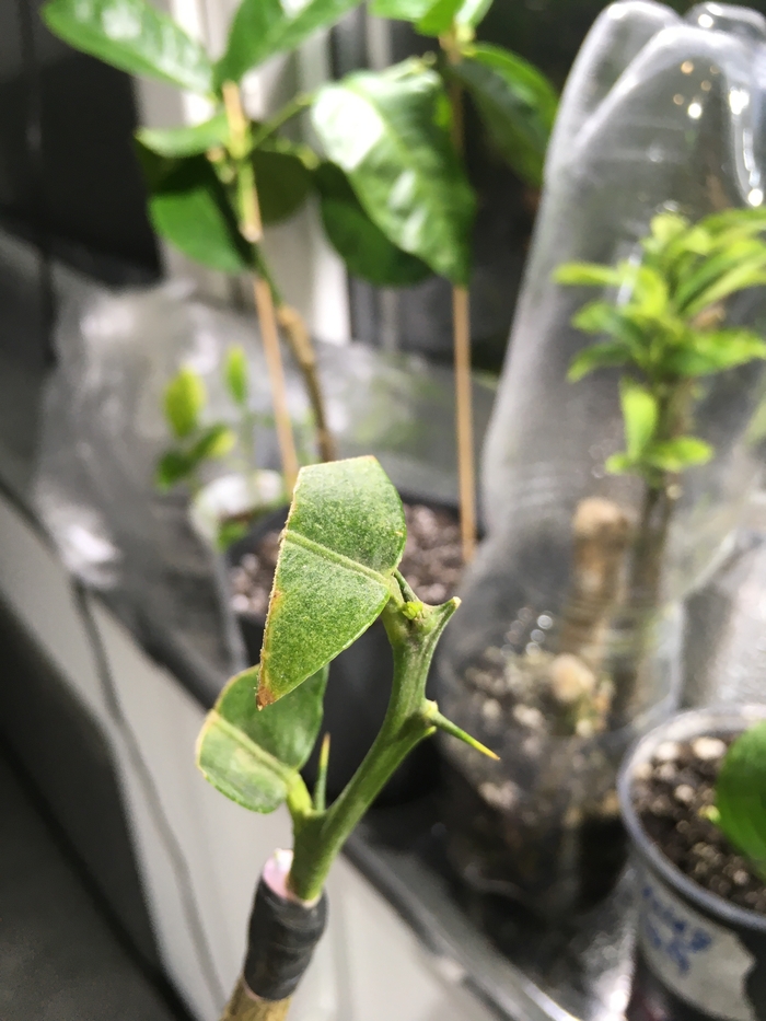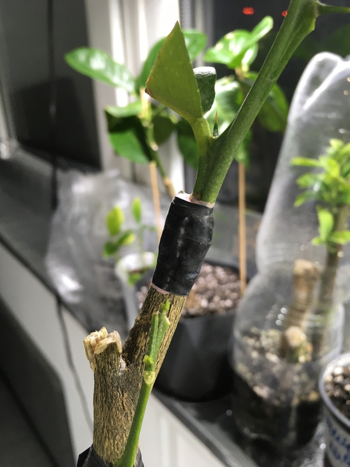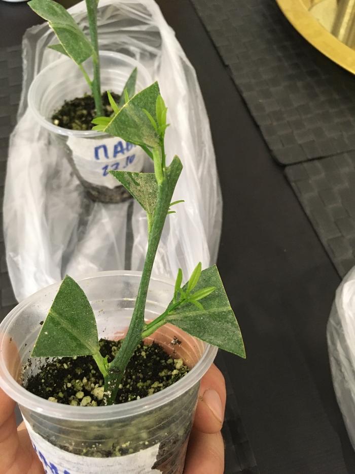 На всех прививках пошли приросты, одна, увы, не прижилась, такое бывает. Прививки разных сортов, а именно Мейер, неизвестный мне сорт лайма, мандарин Уншиу, Пандероза.