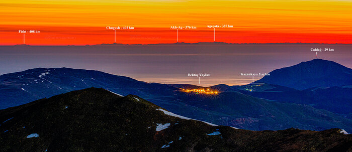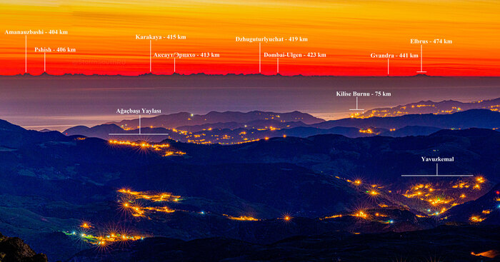 Этого момента он ждал целый год, тщательно анализируя атмосферные условия, а в мае 2025 года он отправился в Турцию, поднялся на вершину горы Карагёль высотой 3107 метров и сделал этот невероятный снимок с максимально возможного для наблюдения Эльбруса расстояния (от вершины горы Карагёль до вершины Эльбруса по прямой 474 км)