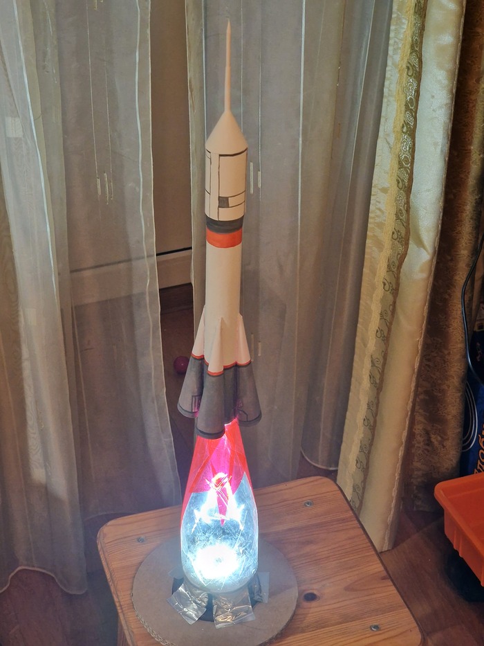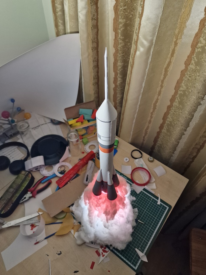 Намотал бумагу формата А4 на втулку от фольги. Диаметр носовой части увеличивал за счёт намотки нескольких слоев. Нос и двигатели - простые конусы из бумаги, всё клеил на клей Титан