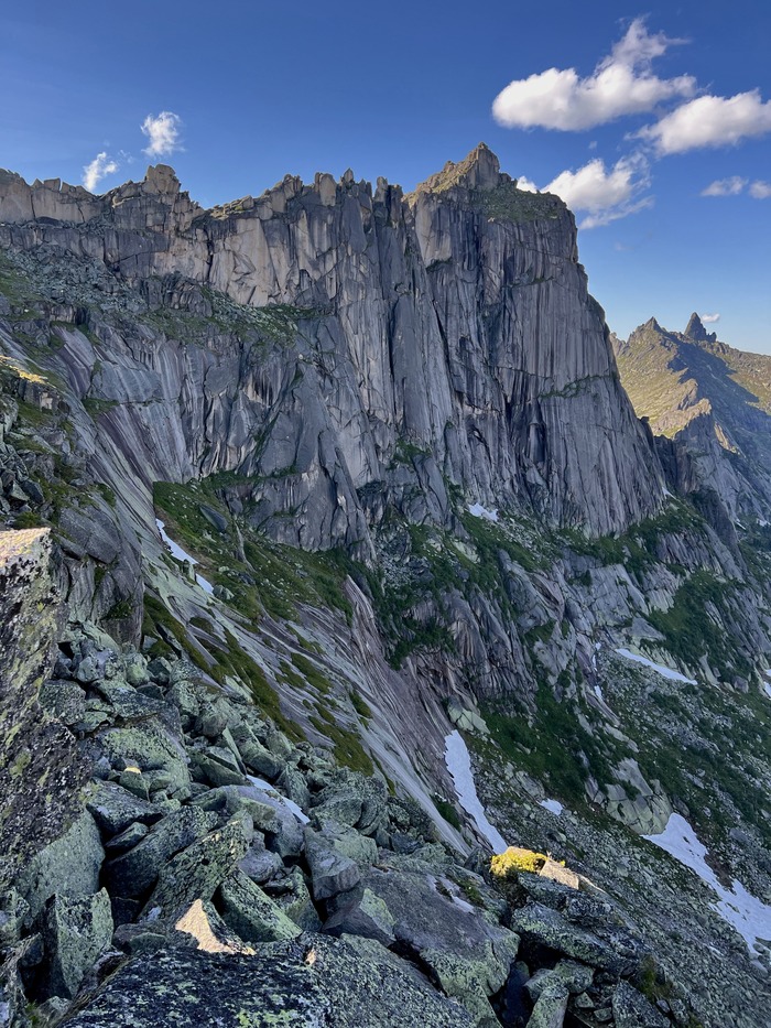 С рюкзаками конечно тяжелее, но все преодолимо. А вот спуск был максимально едреный. Большие камни, с человеческий рост и выше (их тут называют «чемоданами»), очень крутой уклон, местами лежали снежники, наступая на которые ноги скользили.