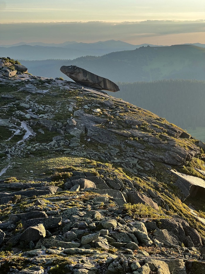 Тропа вокруг озера местами довольно крутая, с опасными склонами. Потихоньку дошли по ней до Висячего камня, конечно попробовали его столкнуть, крепко сидит!