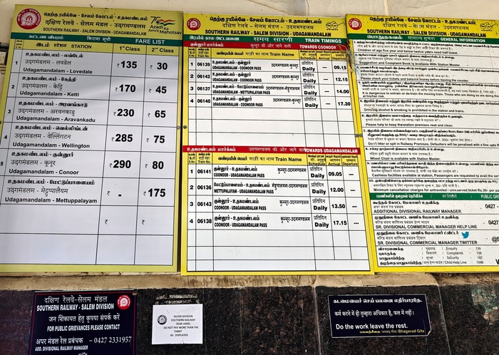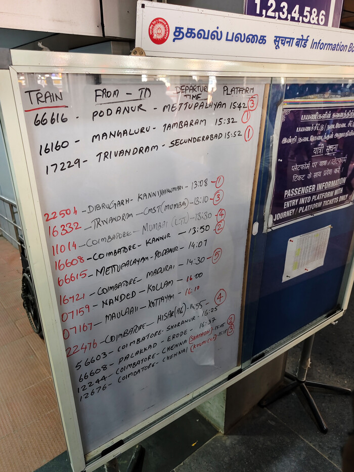 Расписание поездов в Коимбатуре написано вручную, периодически обновляется. Билет до Метту стоит всего 10 рупий.