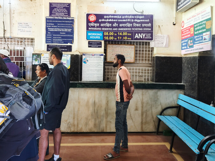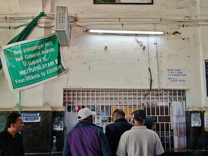 Короче. Я пришёл в кассы в 6 утра, чтобы успеть купить билет на дневной поезд. В зале уже стояло человек 30, хотя кассы начинают работу в 8:00. Облом - утром продают билеты на утренний поезд, он идёт лишь до Кунура (Coonoor). Мне сказали приходить к 13:30 - хотя по факту продажа на мой поезд открылась даже раньше.