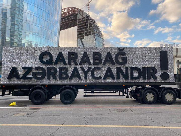 На стенде поверх номерных знаков большими буквами написано «Карабах — это Азербайджан!».