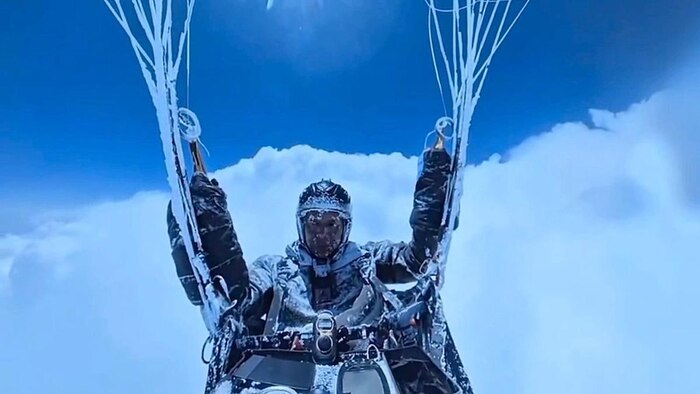 Камера, закреплённая на подвесе, зафиксировала, как у Пэна начали неметь руки и появляться признаки обморожения лица. Несмотря на нехватку кислорода и резкие перепады давления, он сумел удержать управление и выйти из потока, начав контролируемый спуск. Посадка прошла успешно, хотя состояние пилота требовало медицинской помощи.