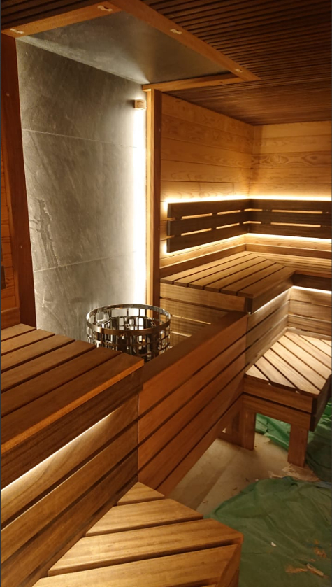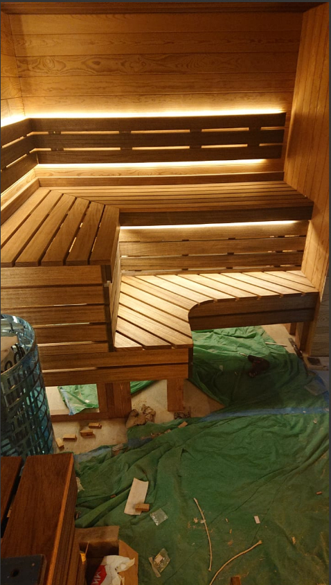 Помещение 5000х2000. Печь электрическая, решили разместить по центру что бы грела равномерно. Справа и слева получились одинаковые г-образные полки где-то 2000х2000. Материал на полках абаш, решили за колеровать, сталкиваюсь с этим впервые (так что будем посмотреть как себя поведут в дальнейшем). На стенах вагонка (больше похожа на имитацию бруса) термо сосна. На потолке липа термо (вид классный, но как материал отстой полный, производитель её просто сжег при сушке), а стоит как боинг, плюс ждали её месяц из Москвы. На стене из соли виден зигзаг подсветки, на фото ярко выражен, а в действительности не так заметен, электрики подключили трансформатор понижающий на 5 светодиодных лент, а их получилось 8, я бы в это окно 2 или 3 ленты впихнул, но мощность транса не позволила. На полу лежит зелёный целофан, убирались после меня узбеки, фотографировал как есть. Для меня главное, что клиент счастлив.