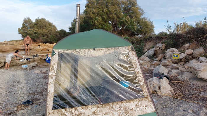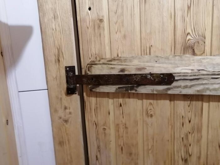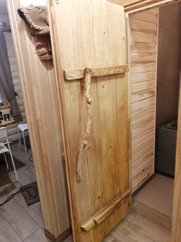 Ручку от краски надо отмыть и поставить. Это ручка от входной двери в бабушкином доме, в котором отец родился. Послужит еще. Так же покрываю лаком. Будет со стороны предбанника,где не так горячо, там где вагонка. Гвозди ржавые у меня есть.
