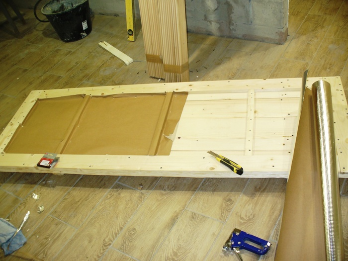 Креплю фольгированную крафт бумагу из остатков. Фольгой внутрь парилки.