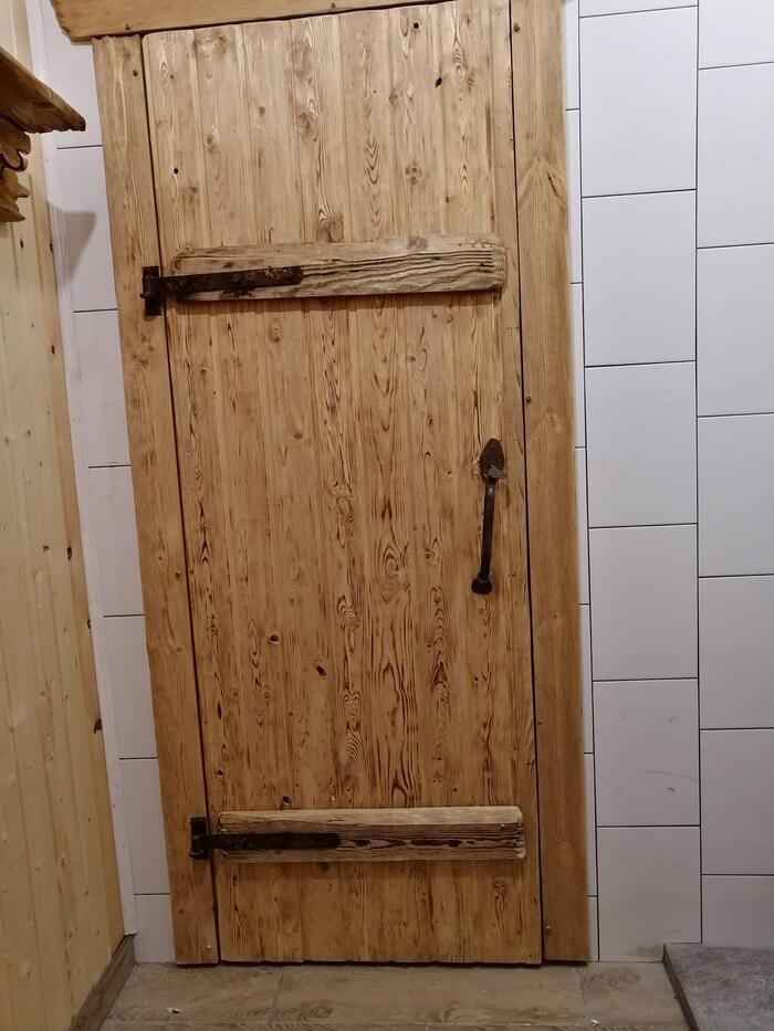 Ну, вот в своем антуражном виде и в наличнике, дверь в парную.