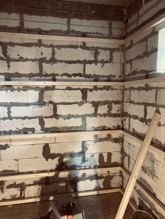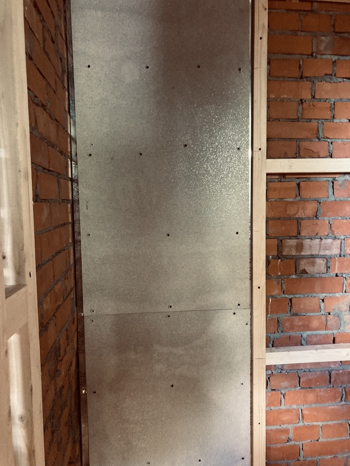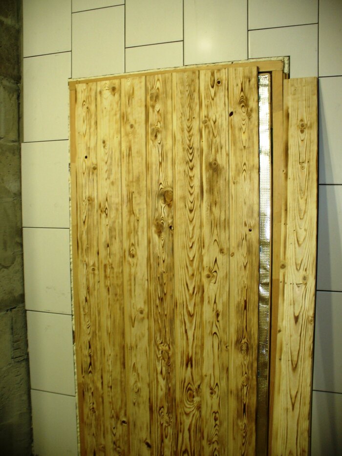 Запечатываю сверху фольгой. Вставляю в проем, распираю прокладками по периметру и зашиваю вагонкой. Вагонка, так же обработана брашированием.Креплю скобами на кляймера. Это сторона в предбанник из парилки.