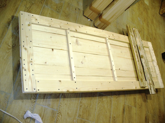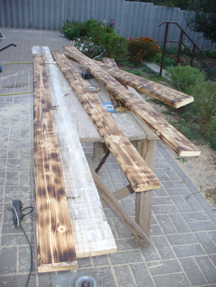 Далее, металлической щеткой вырабатываю более мягкую часть древесины.Потом сглаживаю заусенцы нейлоновой щеткой. Синего цвета.Подбираю и состариваю поперечины.Собираю на саморез . Это сторона ,которая будет в парилке.
