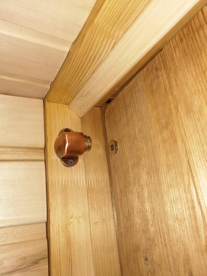 Для хорошего и плотного прилегания двери к коробке я использовал магниты. По принципу двери в холодильнике. Это простое и надежное решение. Мало того, что дверь всегда плотно прикрыта и открывается легким нажимом, так полотно двери всегда притянуто к коробке, что предотвращает выкручивание полотна при намокании и высыхании.
