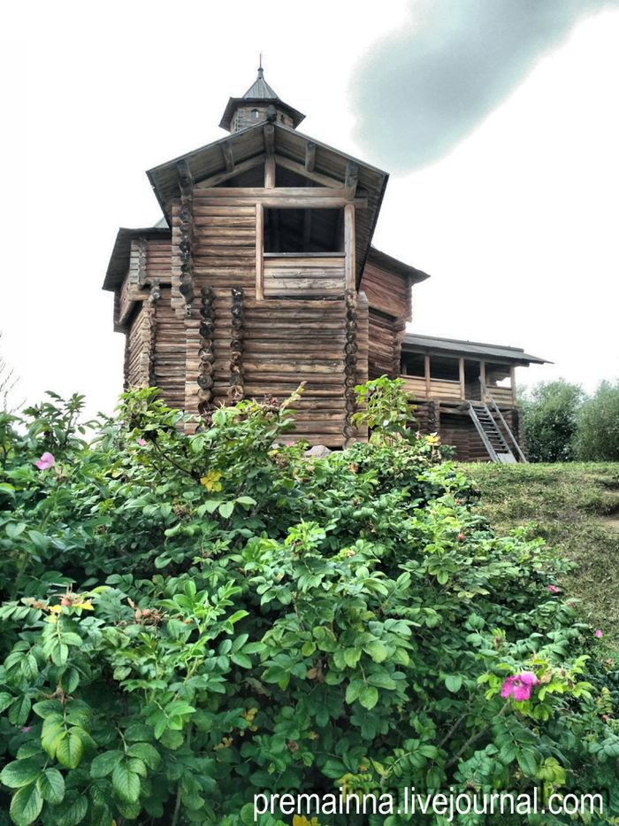 Слева можно увидеть Моховую башню, часть Сумской крепости, которая обороняла от недругов северные владения России в 17 в. К XX веку из 6-ти его башен сохранилось только две. В 1931 г. остатки Моховой башни разобрали и перевезли в Коломенское, где она хранилась в запасниках музея почти 80 лет. И только в начале нашего тысячелетия умелые реставраторы воссоздали памятник в точности таким, каким он был в 1680 г.