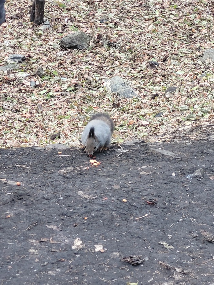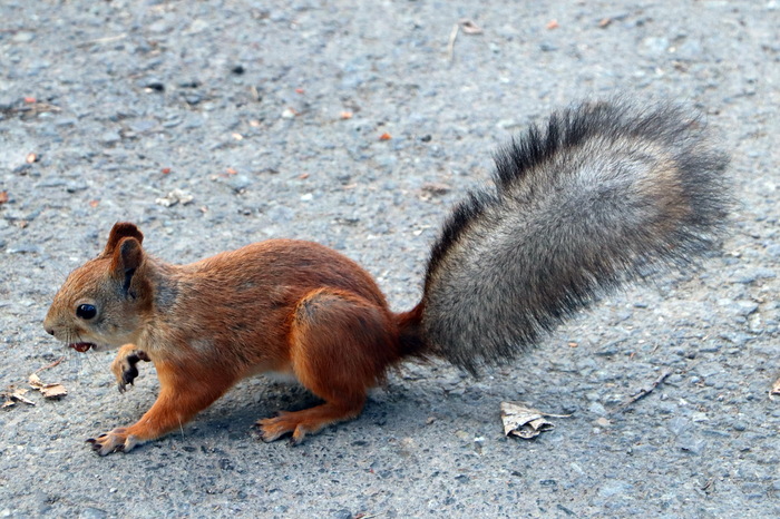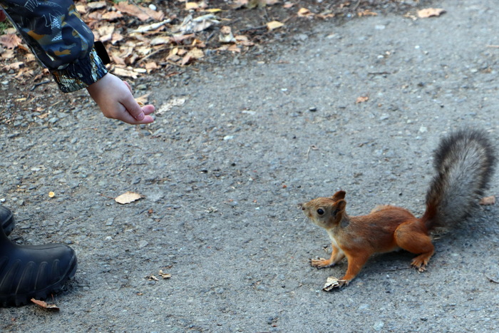Но мы с вами зайдем просто погулять по парку в обычный день. И не с парадного входа, а от переулка Базовый. Первый, кто нас встречает - наглючая белка, выскочила из парка и прямо по дорожке побежала к нам, явно намереваясь отобрать орехи.