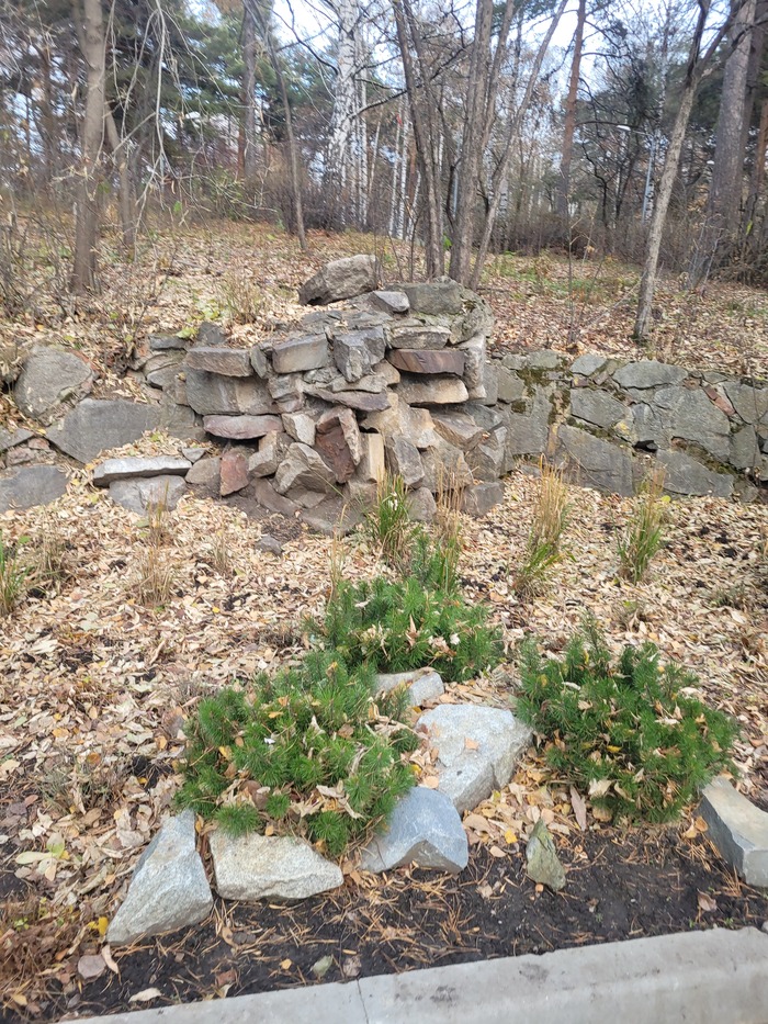 Подпорная стена. Летом, скорее всего, оформлена как альпийская горка. Схожу, проверю.