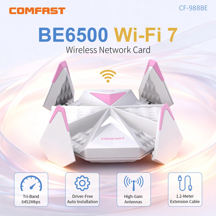 COMFAST CF-988BE представляет собой оптимальное сочетание инноваций и удобства использования, идеальное решение для геймеров, стримеров, профессионалов и всех, кому важна максимальная стабильность и высокая скорость соединения. Этот адаптера выведет ваше взаимодействие с интернет-пространством на совершенно новый уровень качества и комфорта.