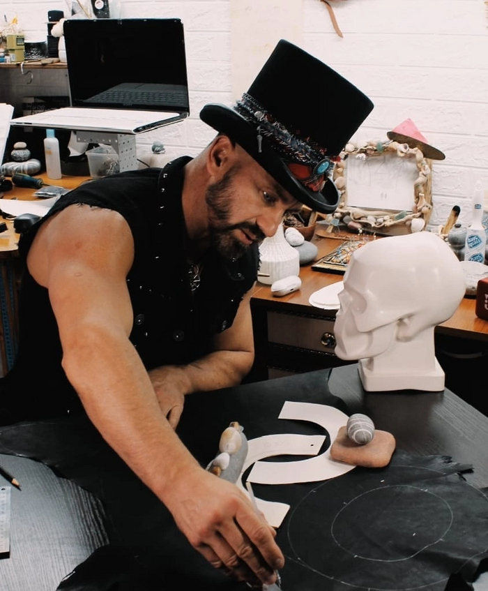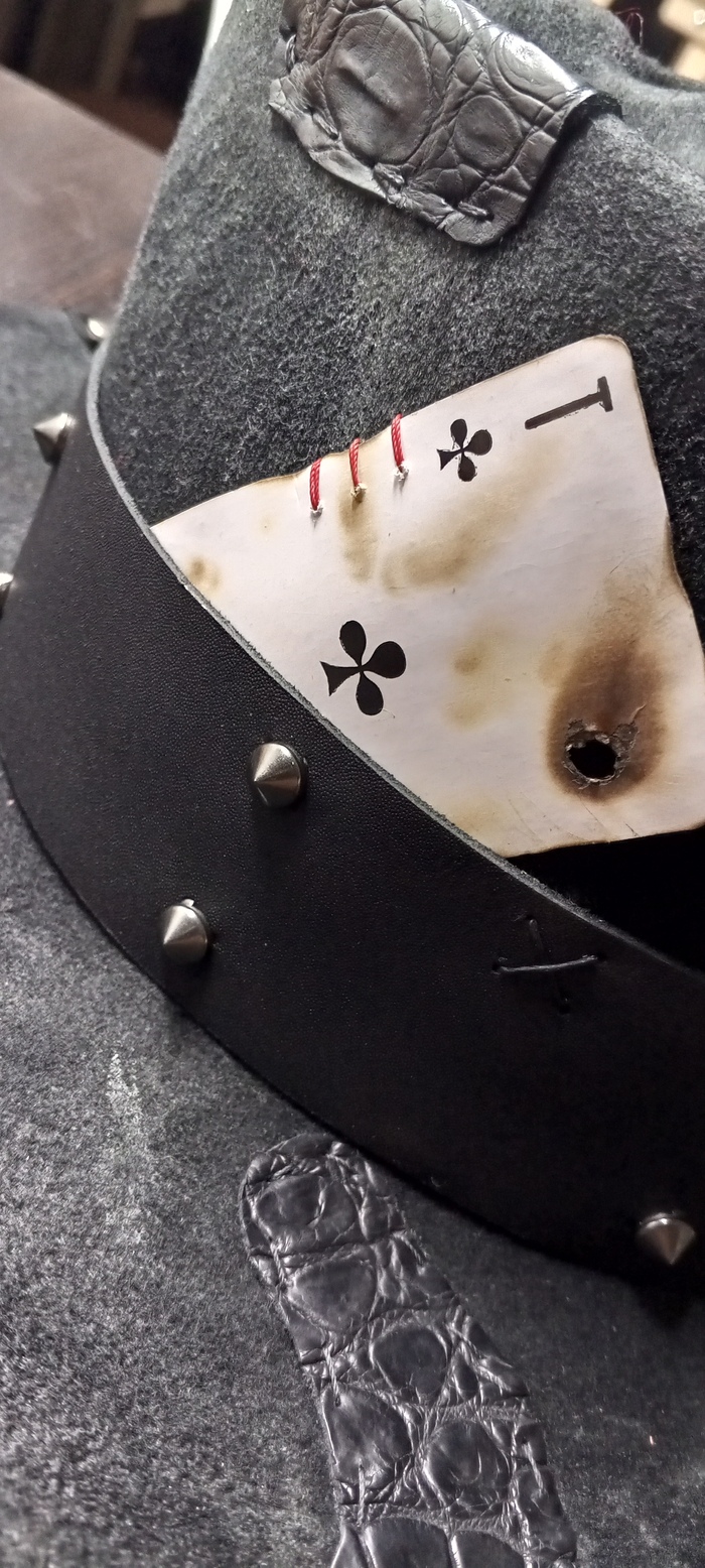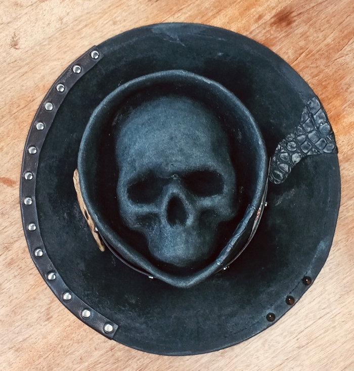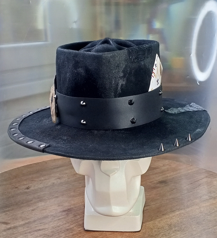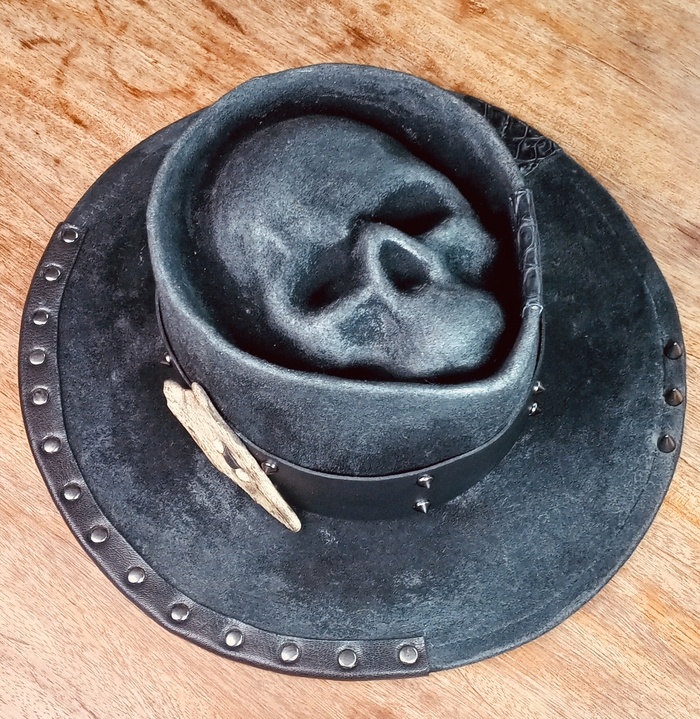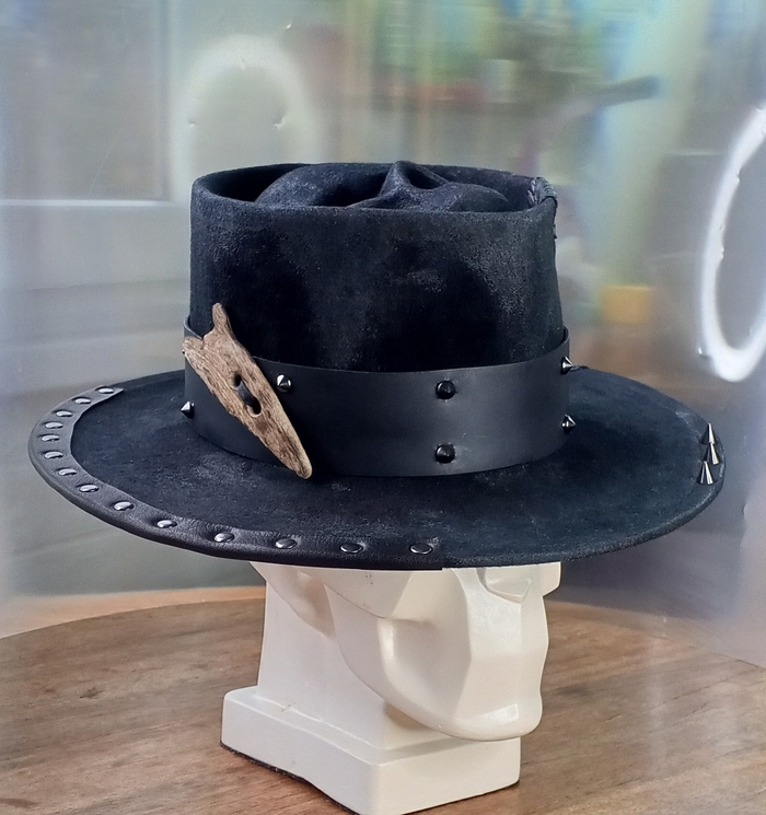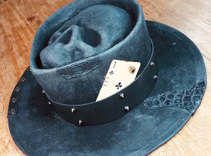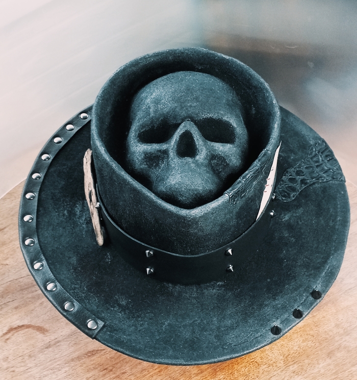 Заказчица попросила сделать шляпу в подарок знакомому на НГ🎄 . Сказала что он любит черепа, карты и шипы🤔 В итоге: Фетровая шляпа с тиснением в виде черепа💀, обожжённая карта♣️, стальные шипы, дрифтвуд (деревяшка с берега моря), кожа крокодила 🐊, кожа быка 🐂, пчелиный воск 🐝 Посылку 📦 с шляпой отправил👍🏻, но пока обратной связи не получил, надеюсь, что размер подошёл и подарок понравился 🤔 Поэтому решил показать фото, которые сделал сам перед отправкой 📸🙌🏻 Собственно я в конце🤠