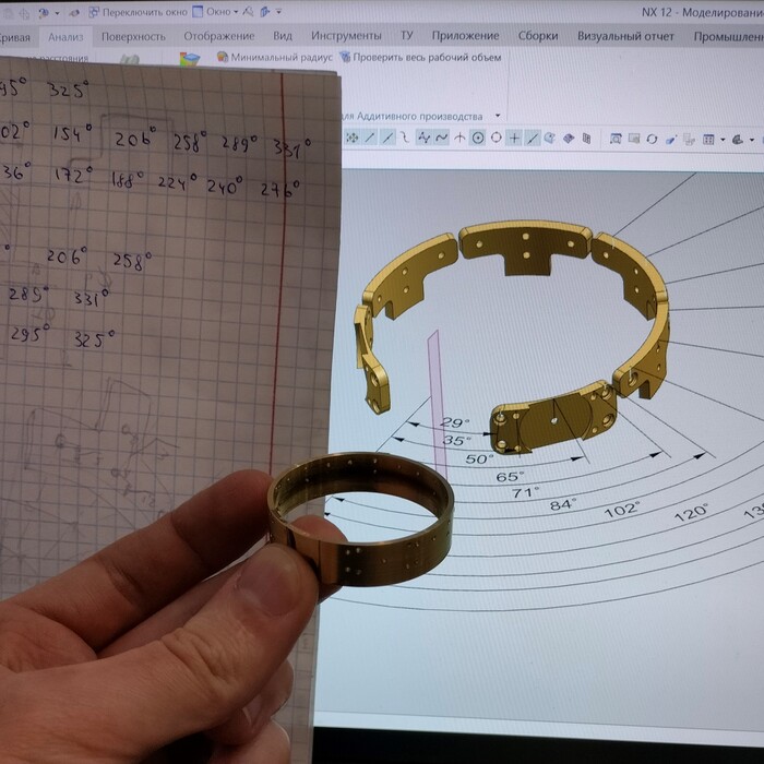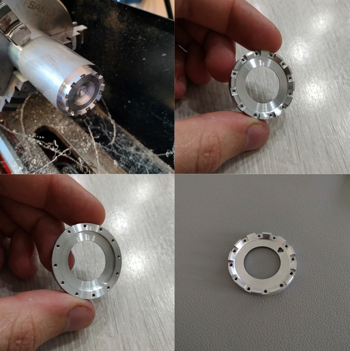 Вот, например, одна из таких операций. Я расположил детали в кольцевой заготовке и, имея на руках углы и расстояния, насверлил отверстия, чтобы всё было чётко и одинаково: