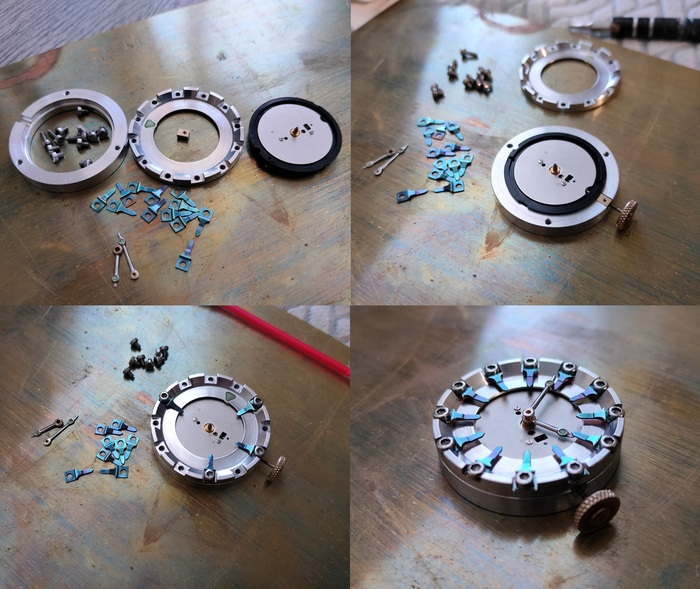 Сборка производилась очень аккуратно: пинцетами, без отпечатков пальцев, без мусора и пыли. И после этого я понял, что все усилия по изготовлению мельхиоровых указателей были не зря. Кроме того, часовая стрелка ходит под указателями, а минутная - над ними. Это результат точного изготовления по 3D-модели, где все зазоры и расстояния были выверены заранее.